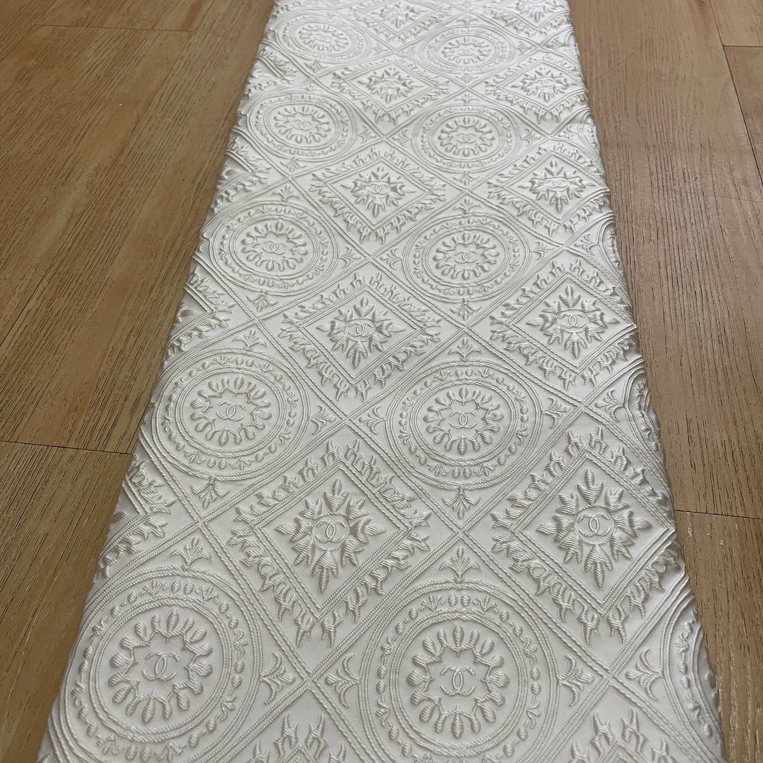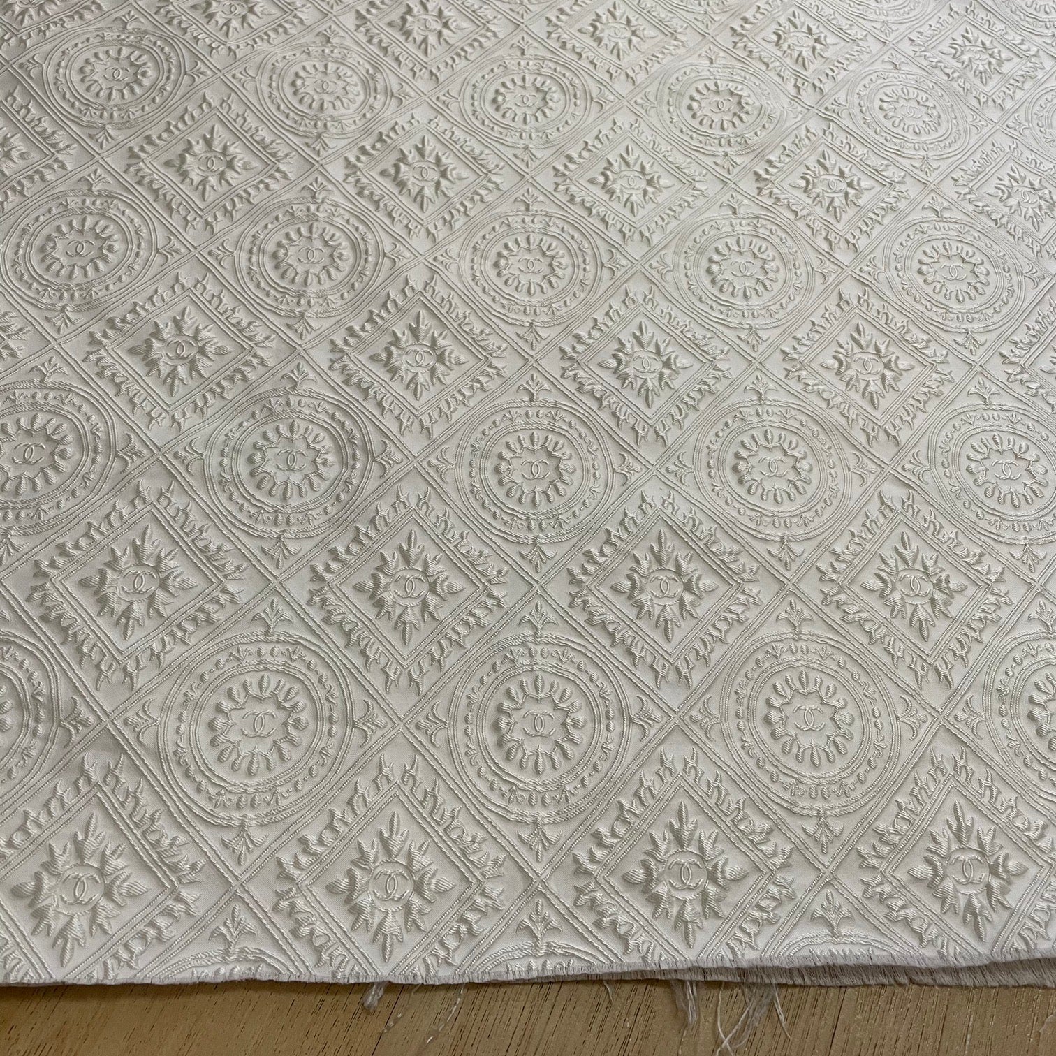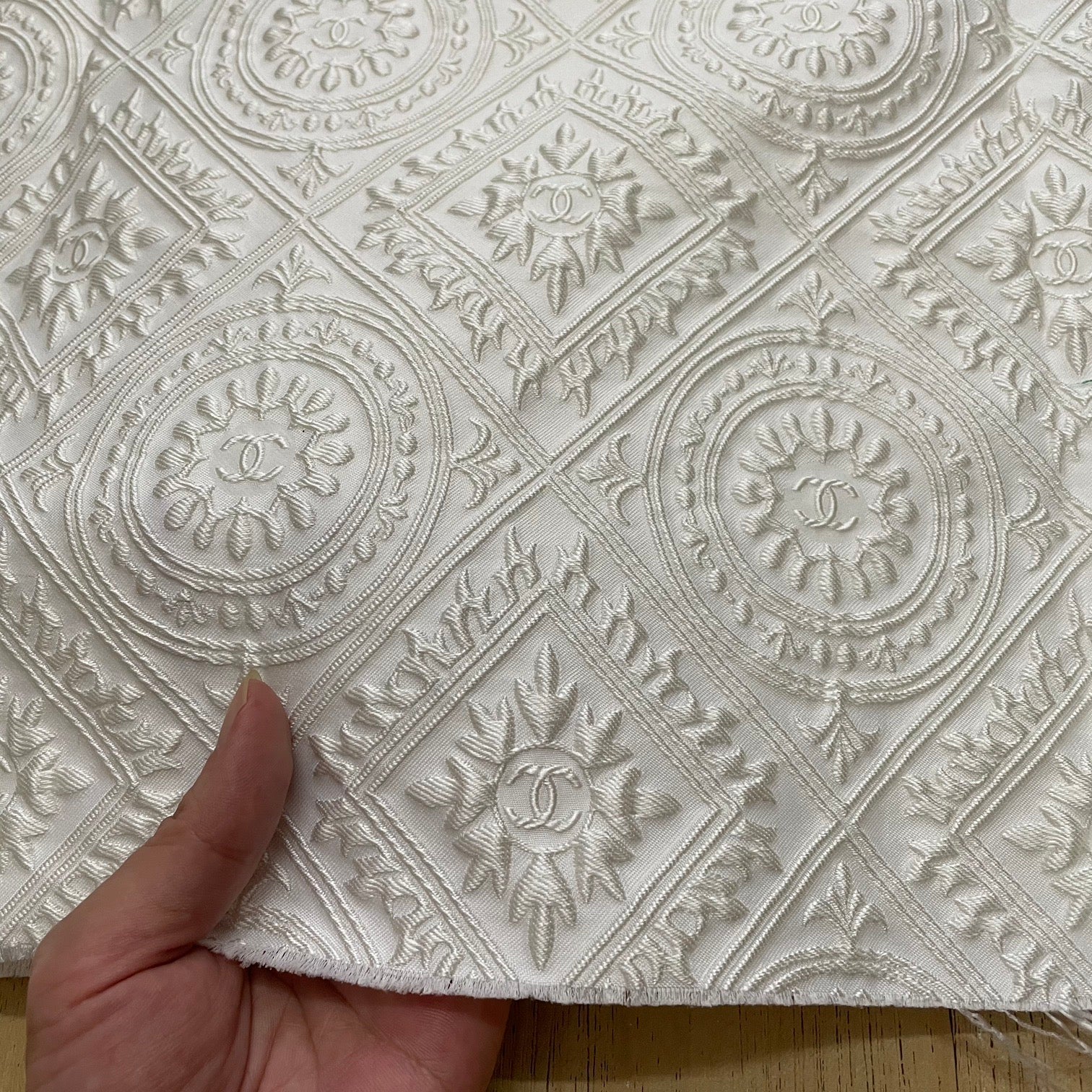 Designer inspired Jacquard fabric CC monogram 3D Pearl White, medium to thick, suitable for clothing and upholstery, ideal for jacket, dress, home decor, sofa, cushion....