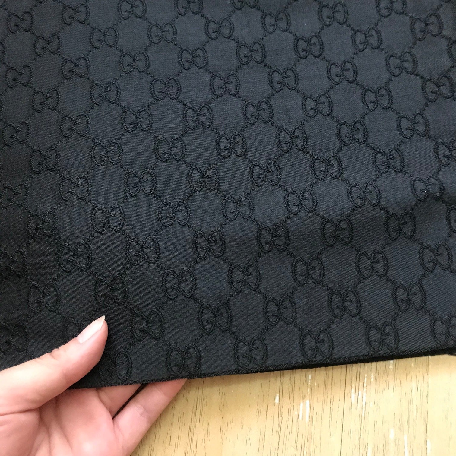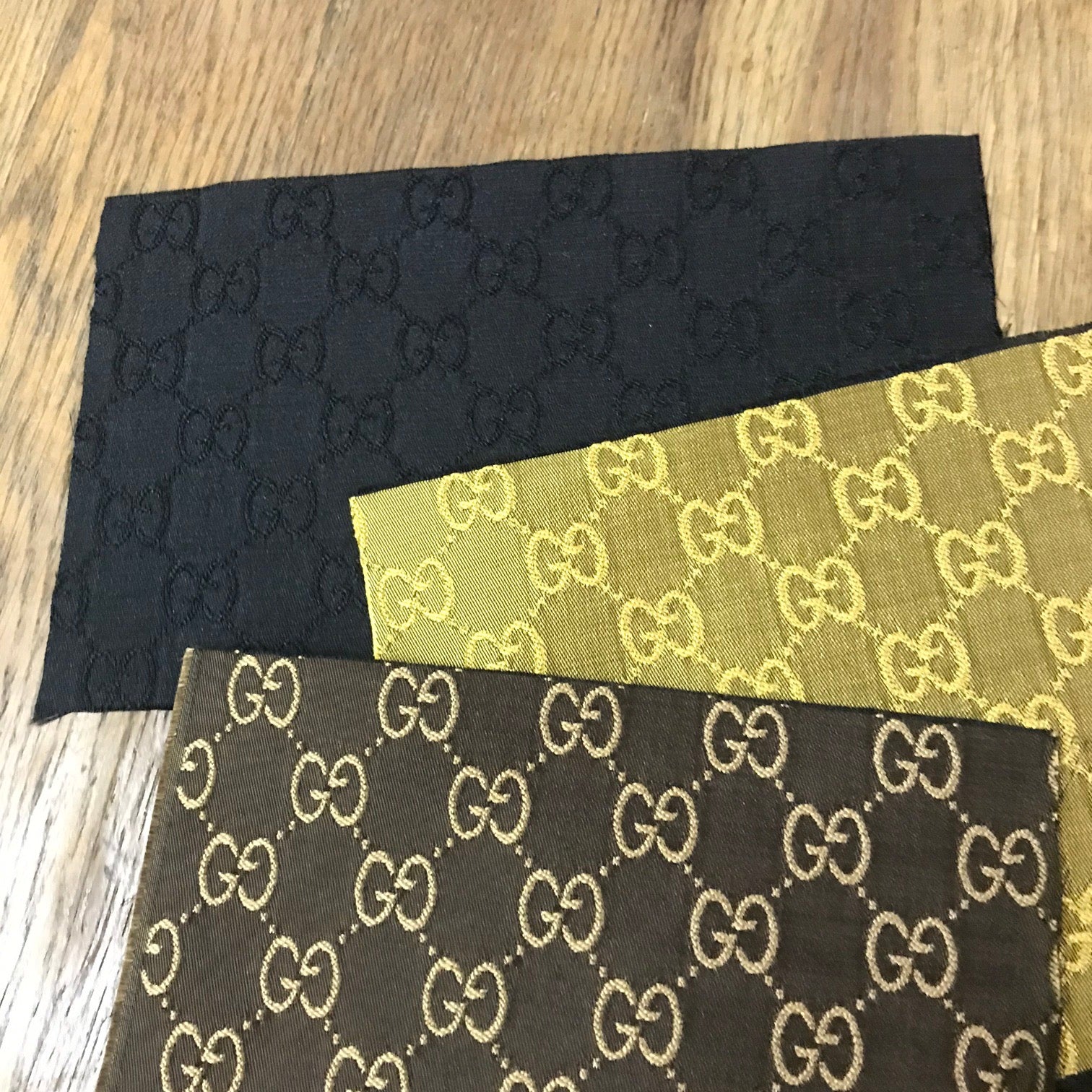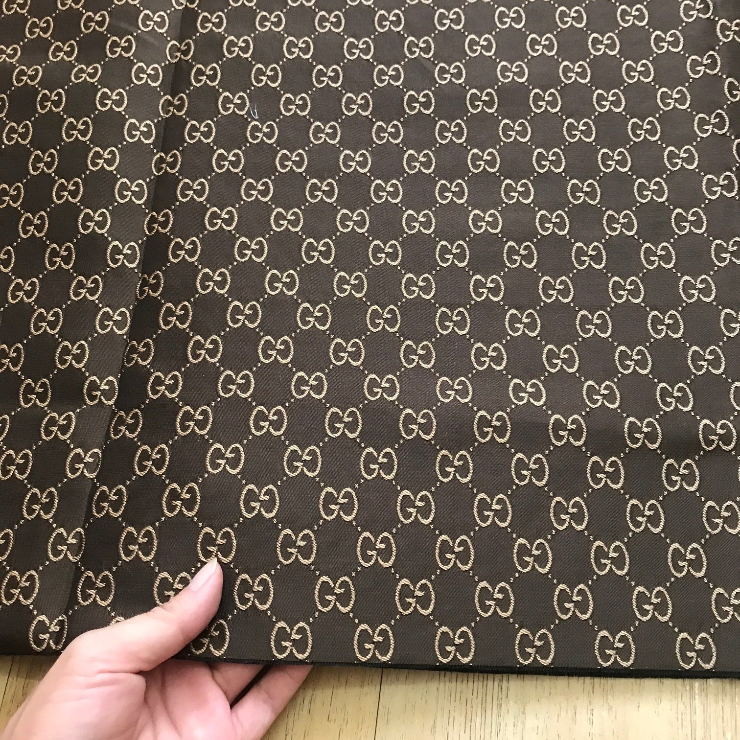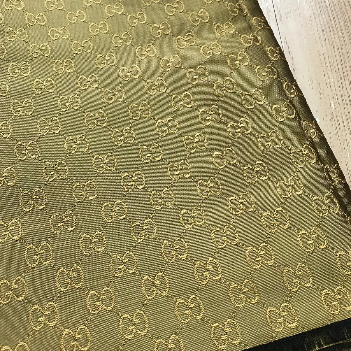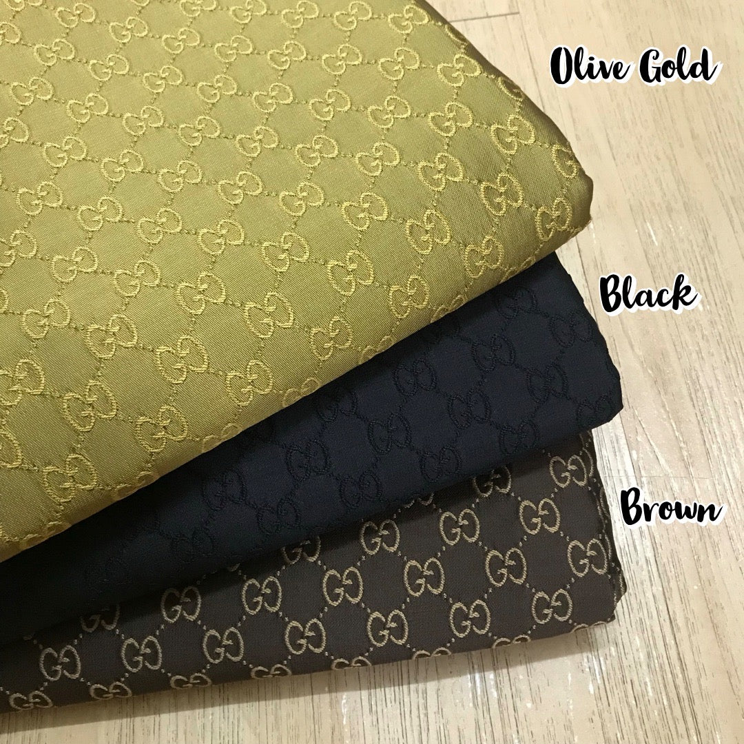 Designer inspired Gucci fabric, 3 colours to choose : Olive Gold, Black and Brown. GG monogram Jacquard fabric, medium to thick, stiffness similar to L05, suitable for clothing and upholstery, ideal for suit, jacket, pant, bag, purse, shoes, sofa, cushion, car seat...