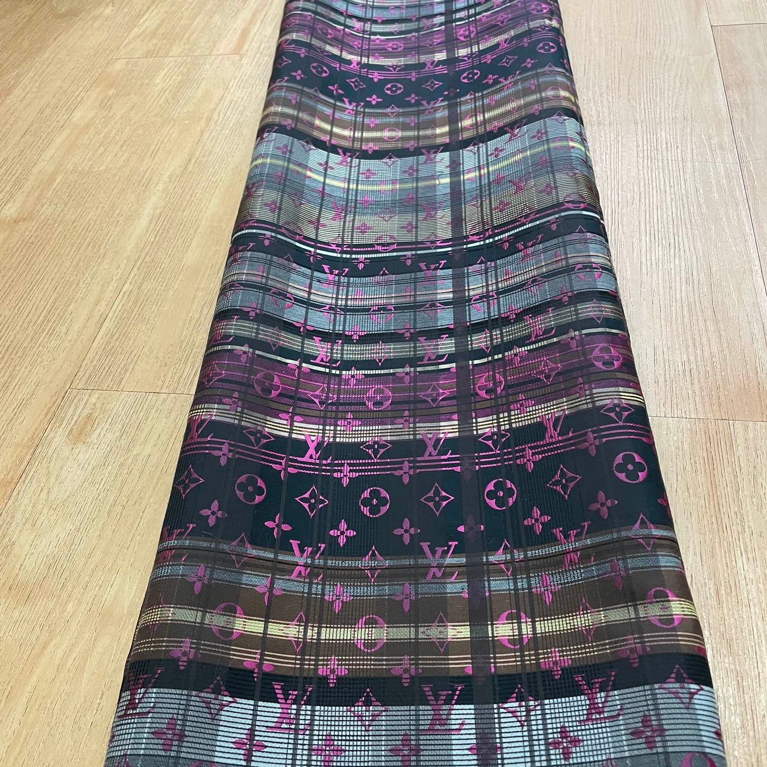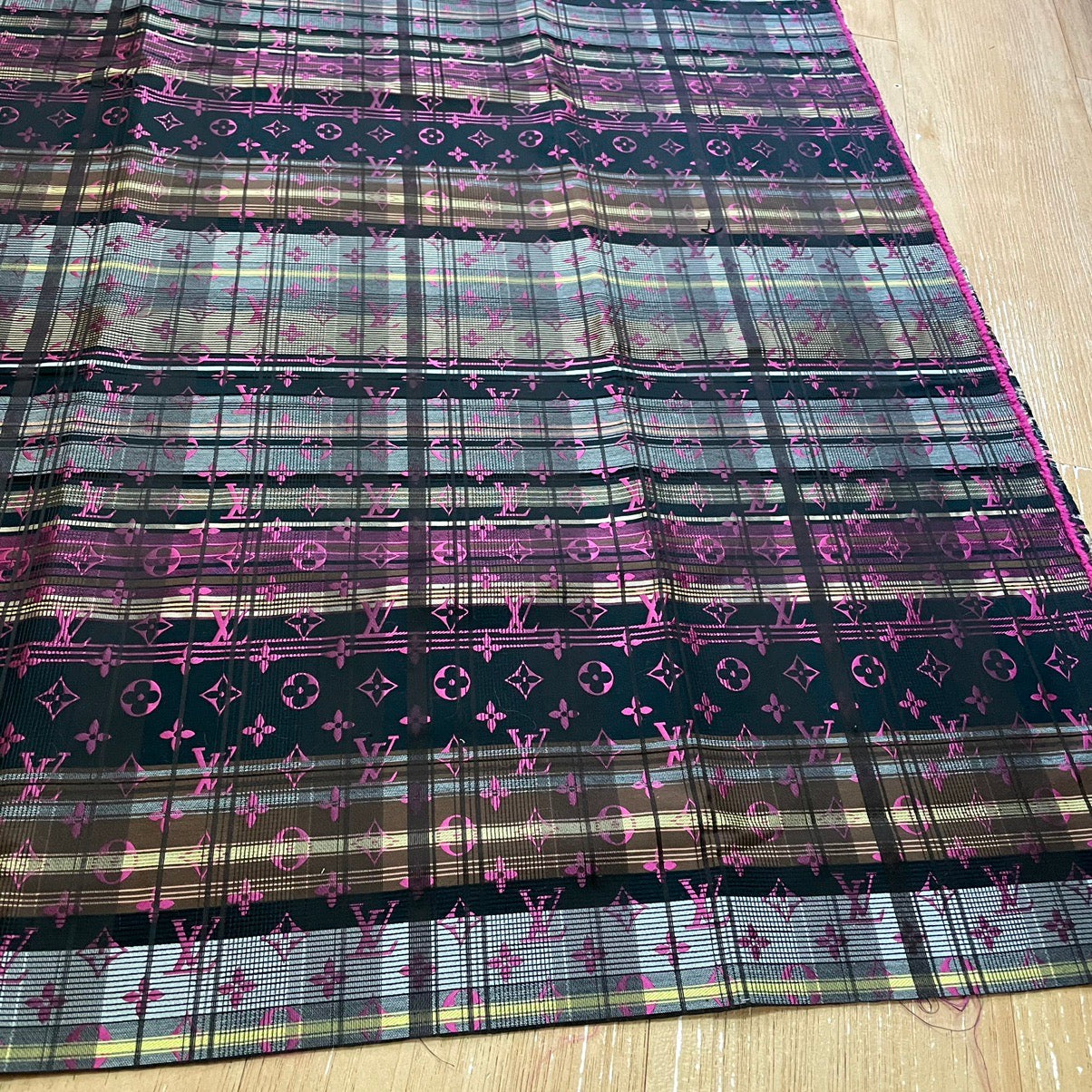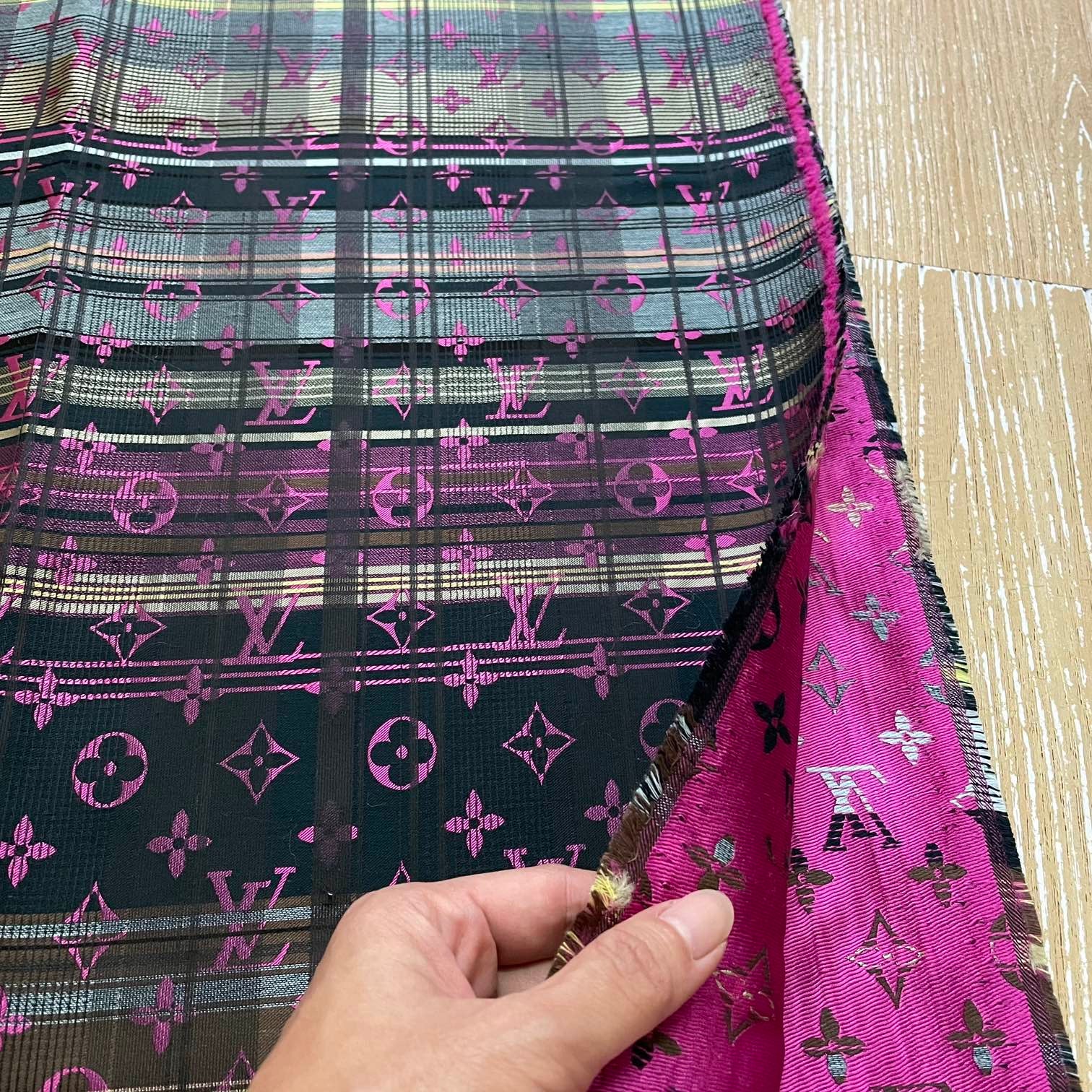 Designer Inspired LV Jacquard Fabric Pink monogram on grey/brown/black Plaid background, soft and medium thickness , suitable for clothing, crafting and upholstery : good for dress, skirts, jacket, coat, suit, cushion, curtain, home decor....